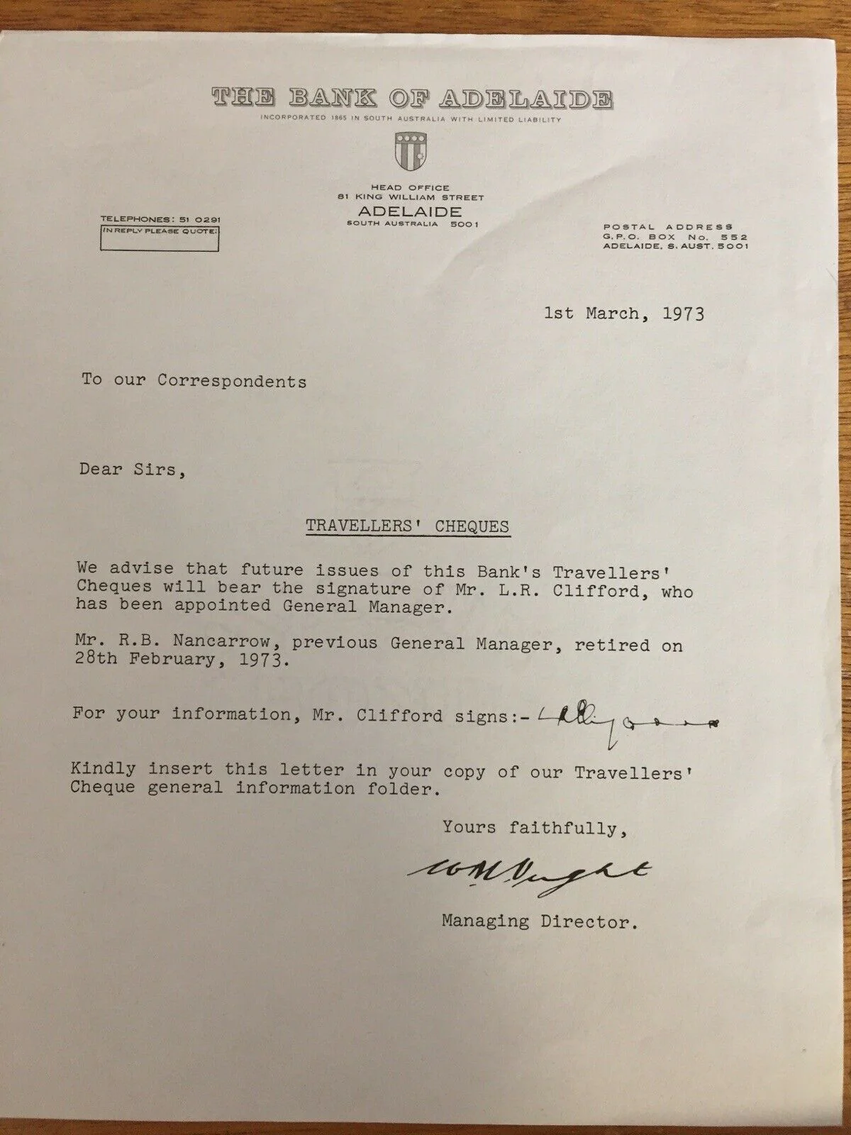 1973 Australian Bank of Adelaide $10, $20 & $50 Travellers Cheque Overprinted Specimen in official folder